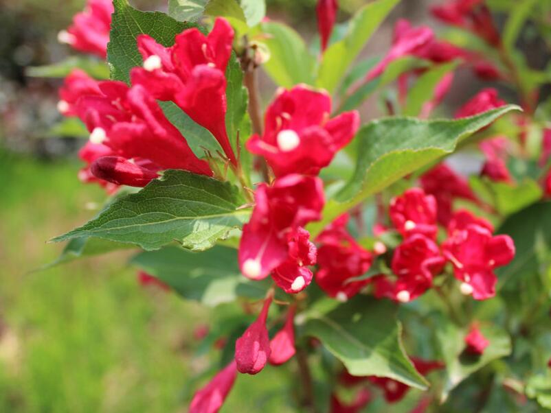 紅王子錦帶的株型十分美觀,枝條修長、花朵稠密且花色鮮艷,盛花期時整體株型似紅球般燦如錦帶,盛花期結束的零星紅花作為點綴搭配綠葉,也頗具有較美的觀賞價值。