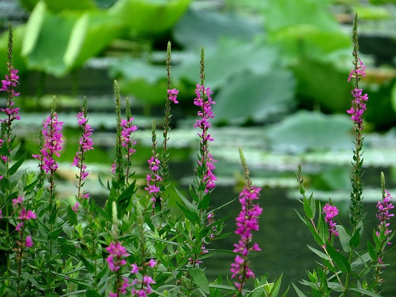 千屈菜又叫水枝柳、水柳、對(duì)葉蓮等,多年水生宿根草本植物,植株高約1米,直立生長,主桿上有許多分枝,葉子對(duì)生,披針形。葉子長4~6cm,寬1cm左右。總狀花絮長在最上面,長約30cm,花朵簇生。